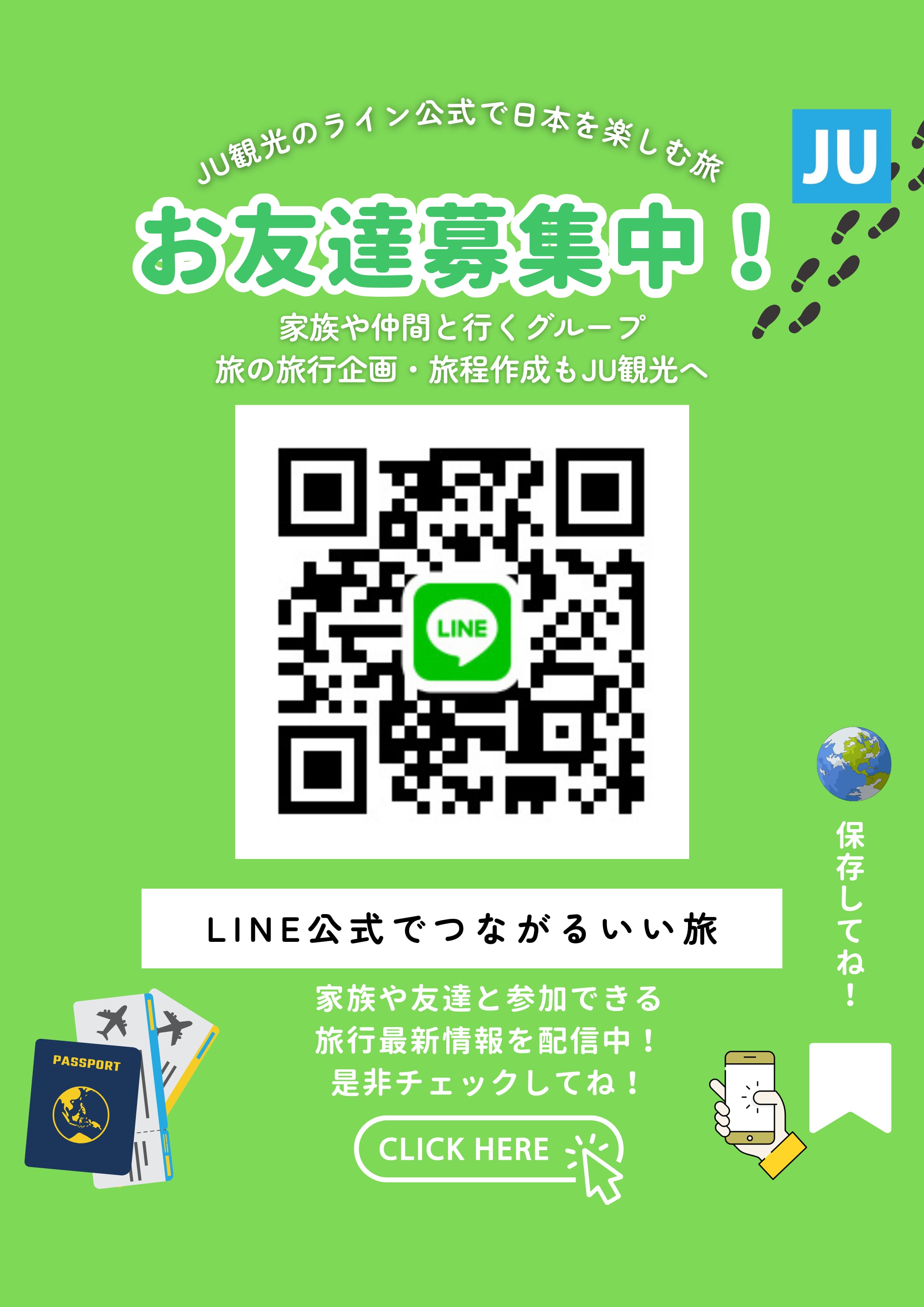 JU観光は旅好きのスタッフが、お客様の旅の計画をサポートしています。団体旅行計画のご相談、研修などビジネスのシーンの旅、大学の旅行、教育、医療関係、団体様の旅も、プランニングから実施まで経験あるスタッフが、唯一無二、サスティナブルな旅を実現いたします。ライン公式にご入会いただくと、連絡も簡単に!ぜひご登録下さい。
