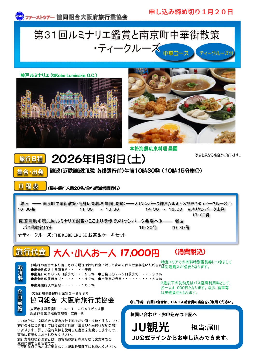 申込ツアー名:1/31 ルミナリエ鑑賞と南京町散策・ティークルーズ